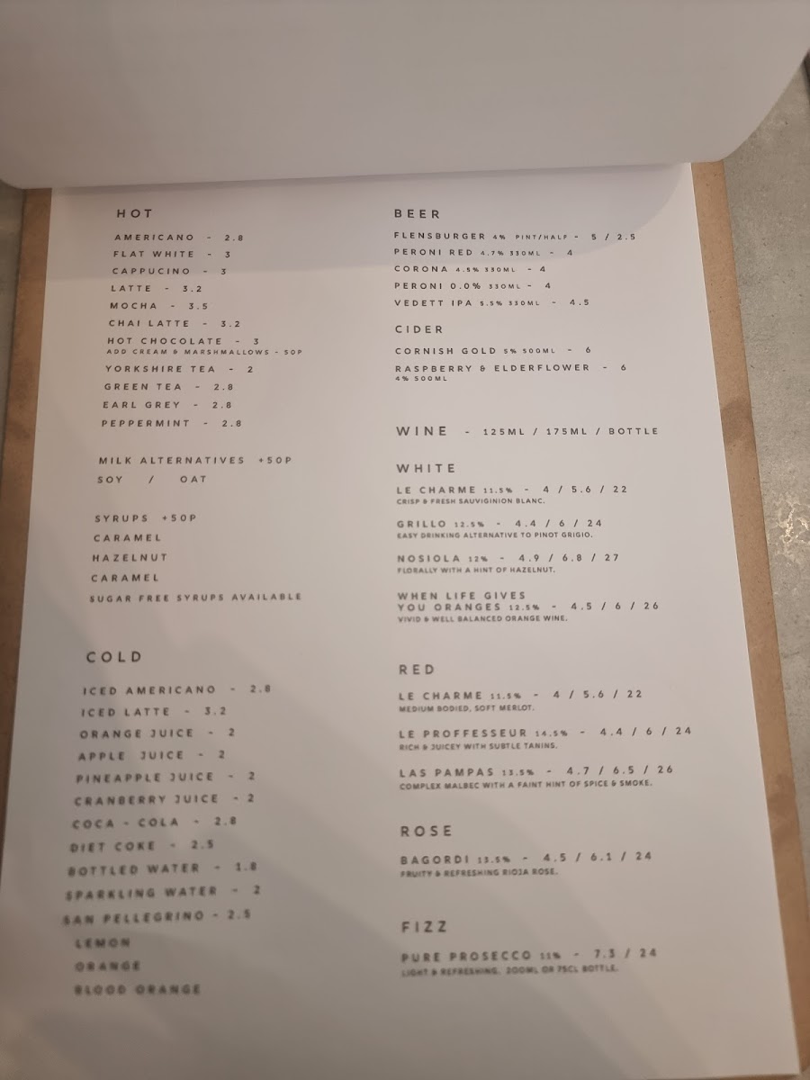 For beverages, the menu offers a range of coffees including Iced Coffee, Latte, Flat White, and Hot Chocolate. In addition to coffee drinks, there is a variety of alcoholic options such as ciders like Cornish Gold and Raspberry & Elderflower, as well as red wines including Le Charme, Le Proffesseur, and Las Pampas. Other wine varieties such as Grillo, Nosiola, When Life Gives You Oranges, and Bagordi are also available.